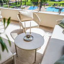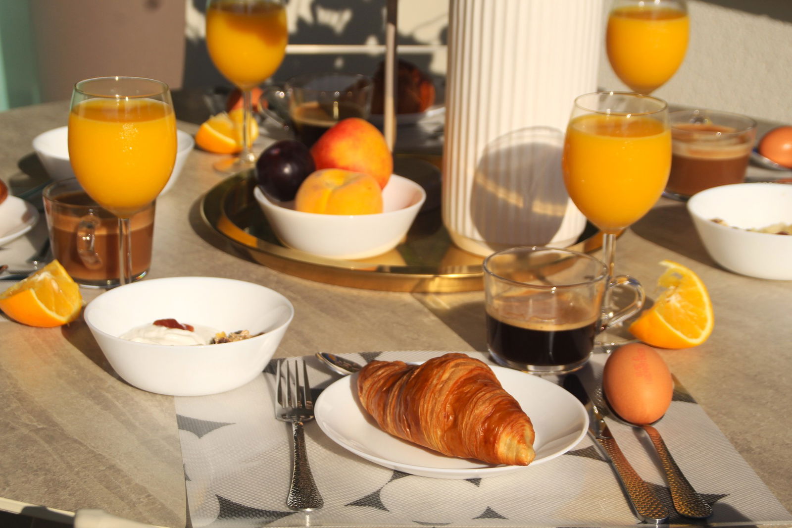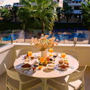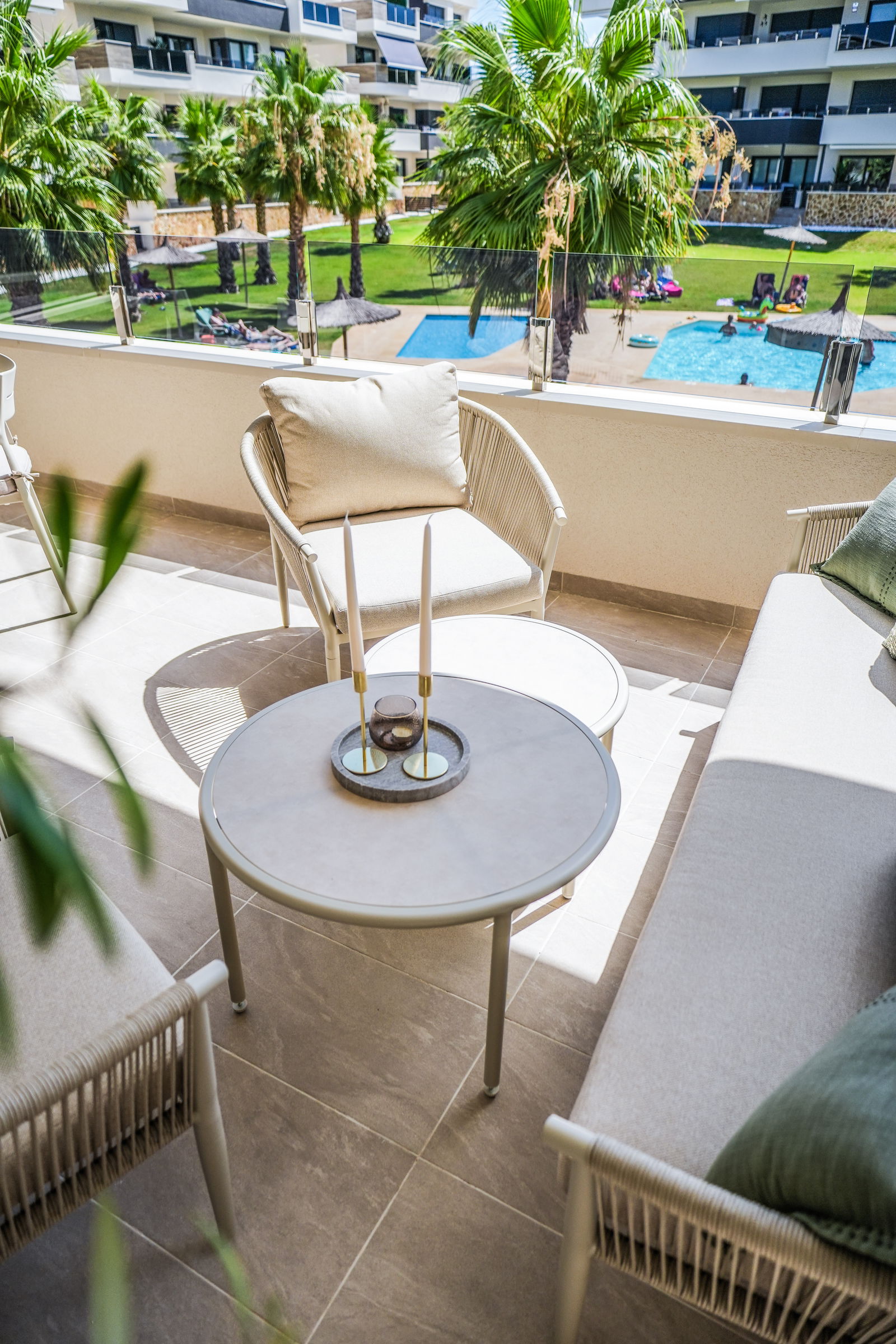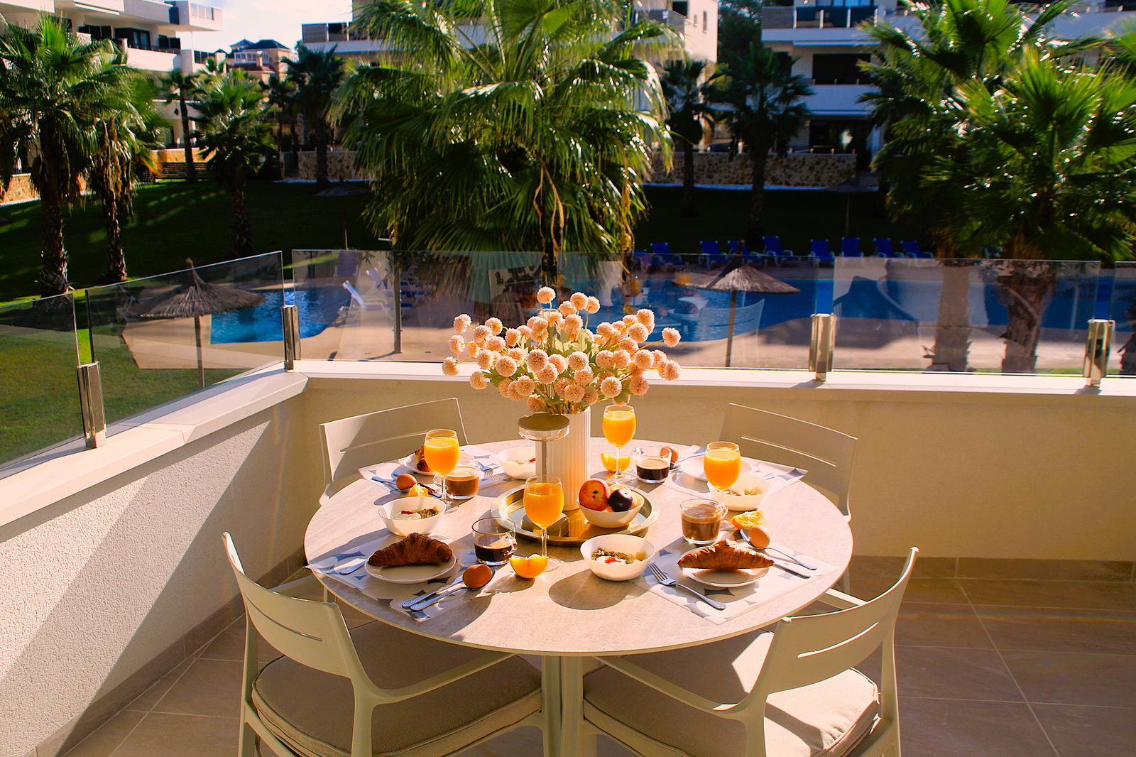 Een ruim terras op het oosten met heerlijke ochtendzon en uitzicht op het gemeenschappelijke zwembad.